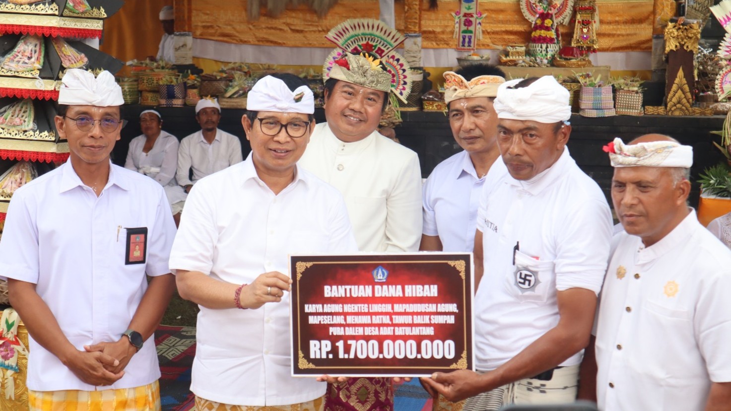 Sebagai bentuk nyata dukungan Pemerintah Kabupaten Badung terhadap pelestarian seni dan budaya, beliau menyerahkan bantuan sebesar Rp 1,7 miliar yang bersumber dari APBD Induk 2026. Bantuan tersebut diserahkan secara simbolis kepada Bendesa Adat Batulantang, Made Sarpa di dampingi Ketua Panitia Karya I Made Pariasa.